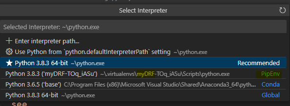 이전에 미리 설치한 가상환경을 찾아 선택하면 된다. vs code에서 가상횐경으로 파이썬 실행환경을 바꿔줘야 다른 프로젝트와 패키지가 꼬여서 프로그램이 정상적으로 실행되지 않는 걸 막아준다.