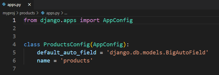 products 폴더 하위에 apps.py에 들어가보면, ProductsConfig라고 해서 products의 이름을 갖고 있는 구조를 갖고 있다.
