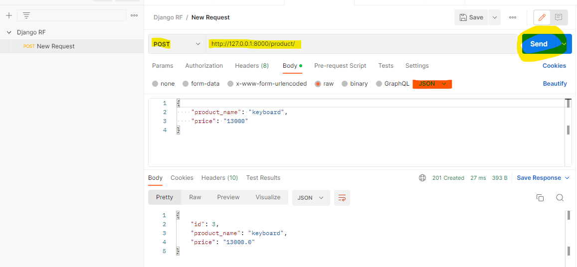 데이터를 생성할 때에는 POST로 설정하고, Body에 필요한 정보를 넣어 send 버튼으로 데이터의 응답이나 오류 메시지를 확인할 수 있다.