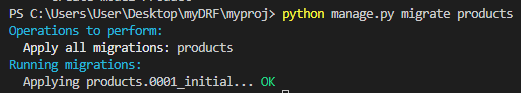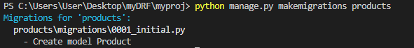 products라는 app에 대해서 model 객체를 생성하고 있으므로 makemigrations 뒤에 app 이름을 명시하면 된다.