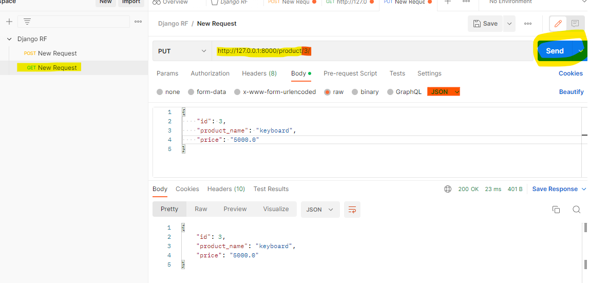 새로운 new Request를 추가로 생성해준다. 주소창에 변경하고자 하는 데이터의 id 값을 넣어줘야한다.