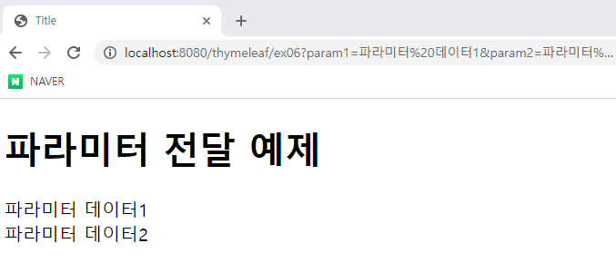 <a th:href="@{/thymeleaf/ex06(param1 = '파라미터 데이터1', param2 = '파라미터 데이터2')}">thymeleaf 파라미터 전달</a>