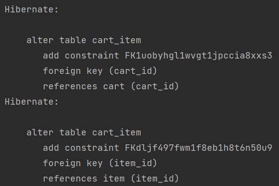 애플리케이션을 실행하면 콘솔창에 cart 테이블이 생성되는 쿼리문이 실행되는 것을 볼 수 있다.