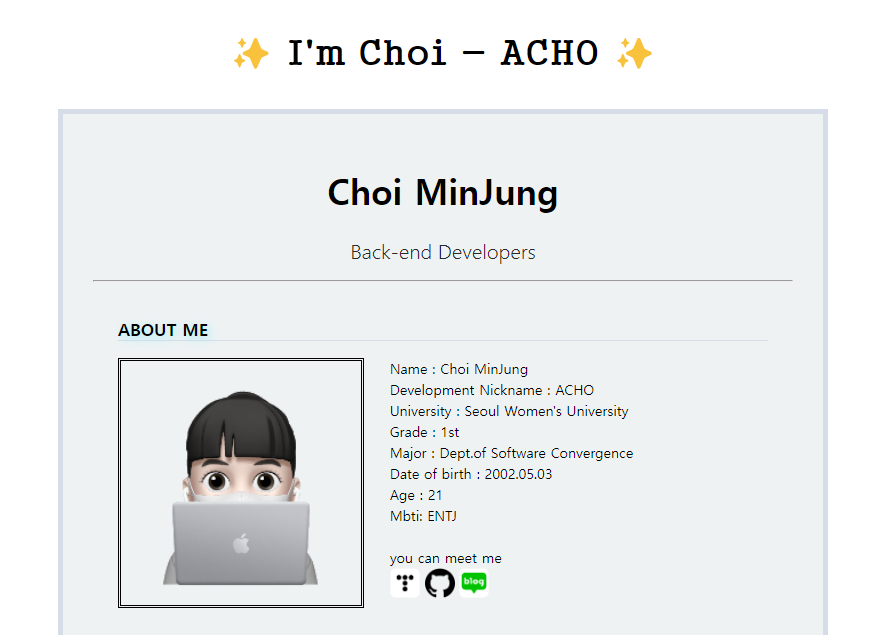 거창하게 이력서라고 하는 것이 웃기긴 하지만, 내 이름과 학교, 전공, 나의 개발 사이트, 과학과 관련된 경험, 개발 프로젝트에 대해 정리한 사이트라고 할 수 있겠다.