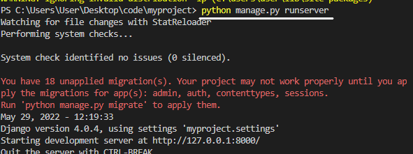 우리가 만든 프로젝트 경로로 터미널을 실행한 후에 해당 명령어를 쓰자(가상환경 경로 터미널로 실행할 경우 에러 발생)