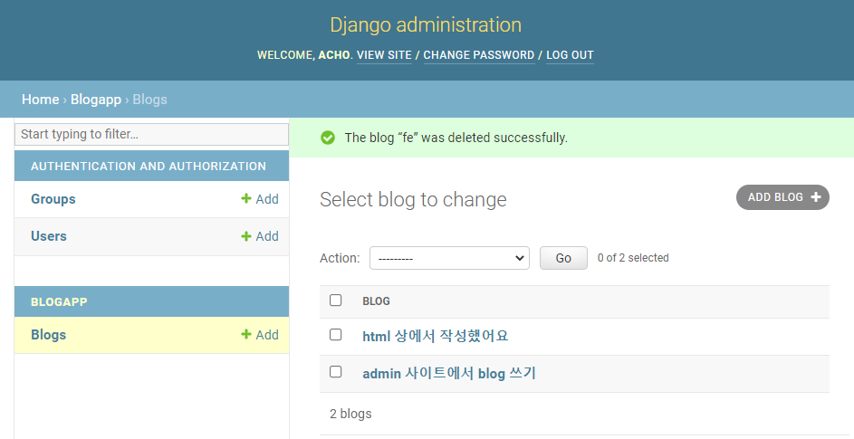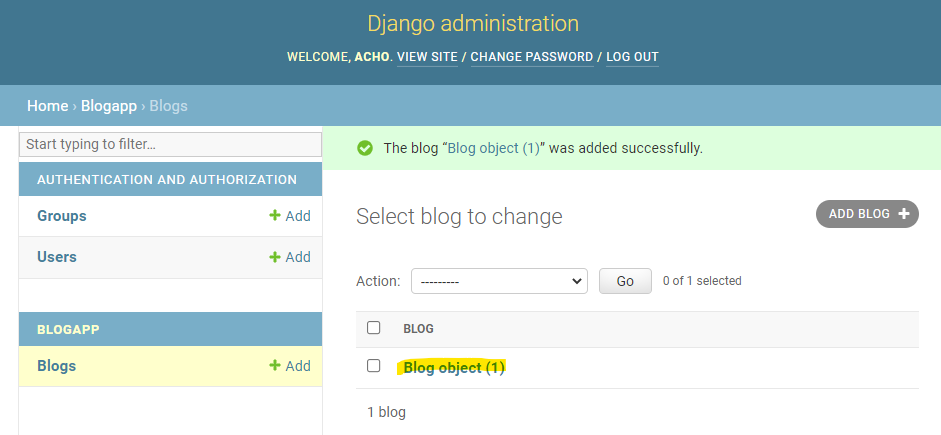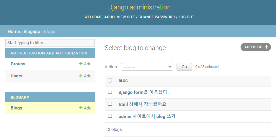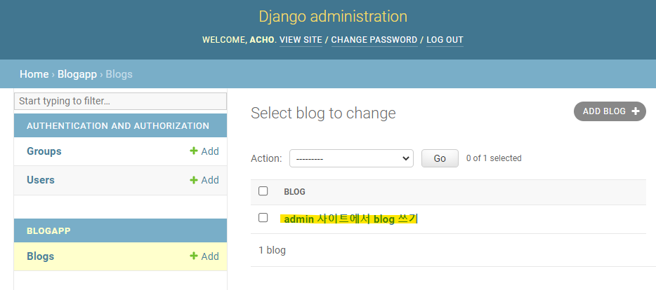 Blog 객체가 잘 만들어졌는지는 어플리케이션 폴더 안에 admin.py 파일에서 확인할 수 있다.