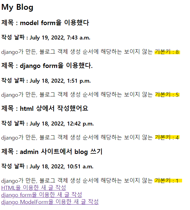 django가 만든, 블로그 객체 생성 순서에 해당하는 보이지 않는 기본키 : {{ post.id }}