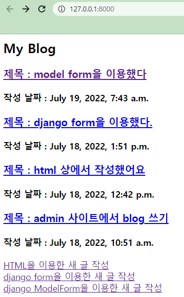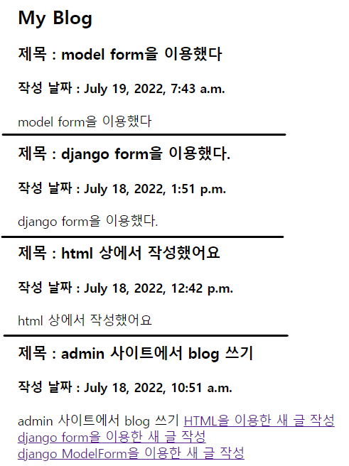 | [멋쟁이사저처럼10기] Django 블로그 만들기(글 생성-사용자입력) (0) | 2022.07.04 |