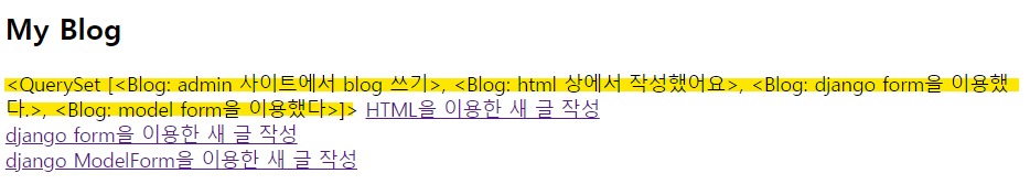 QuerySet으로 감싸진 형태로 렌더링이 되었음을 확인할 수 있다.