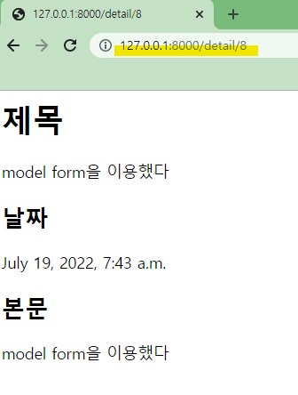 #127.0.0.1:8000/detail/1    첫번째로 생성된 글