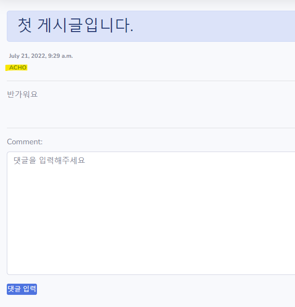 | [멋쟁이사저처럼10기] Django 개발자 대나무숲 프로젝트(댓글 구현하기) (0) | 2022.07.09 |