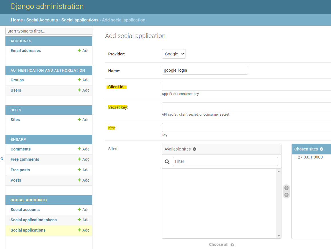 4. admin사이트 > Social applications에 등록