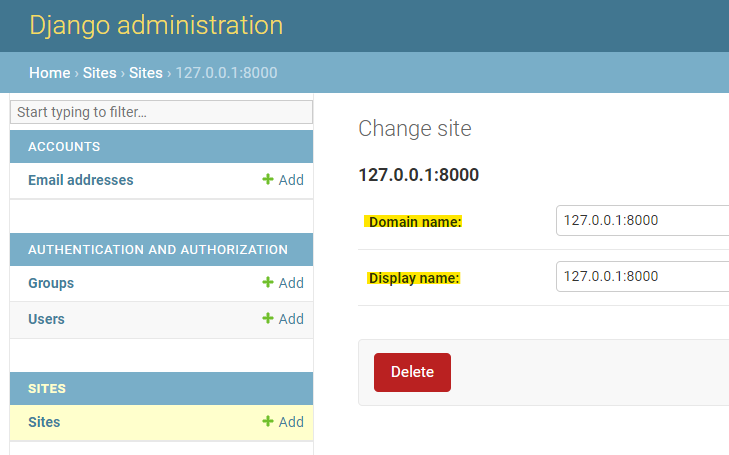 Post-Installation In your Django root execute the command below to create your database tables: Now start your server, visit your admin pages (e.g. http://localhost:8000/admin/) and follow these steps: Add a Site for your domain, matching settings.SITE_ID