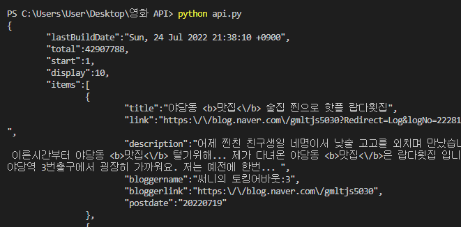 # url = "https://openapi.naver.com/v1/search/blog?query=" + encText # json 결과