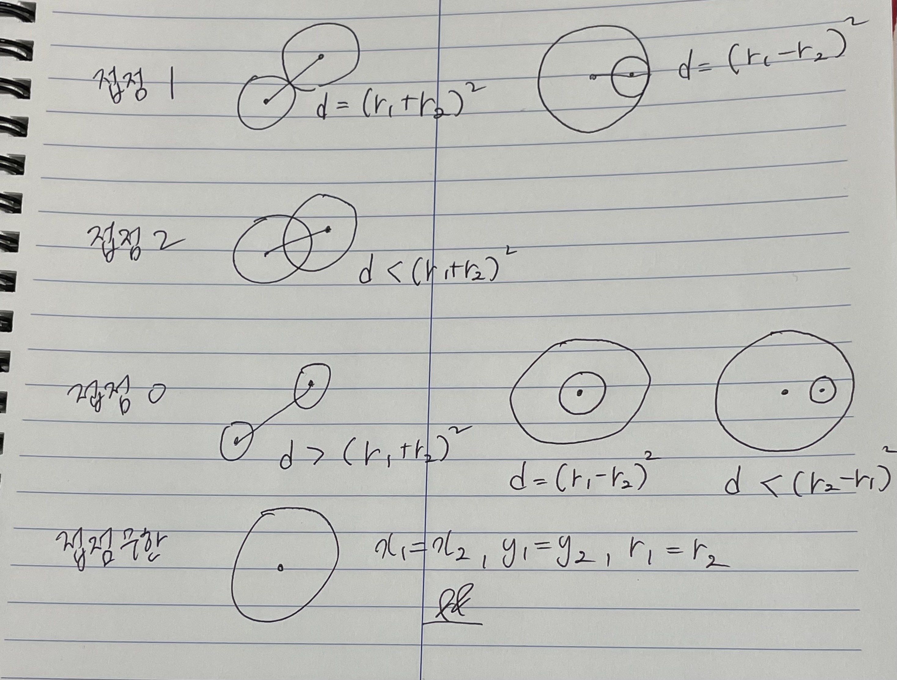 일단 임의의 좌표를 설정해서 원을 그린 후 크게 한 점에서 만날 때, 두 점에서 만날 때, 만나지 않을 때, 접점이 무한개일 때로 나누었다.