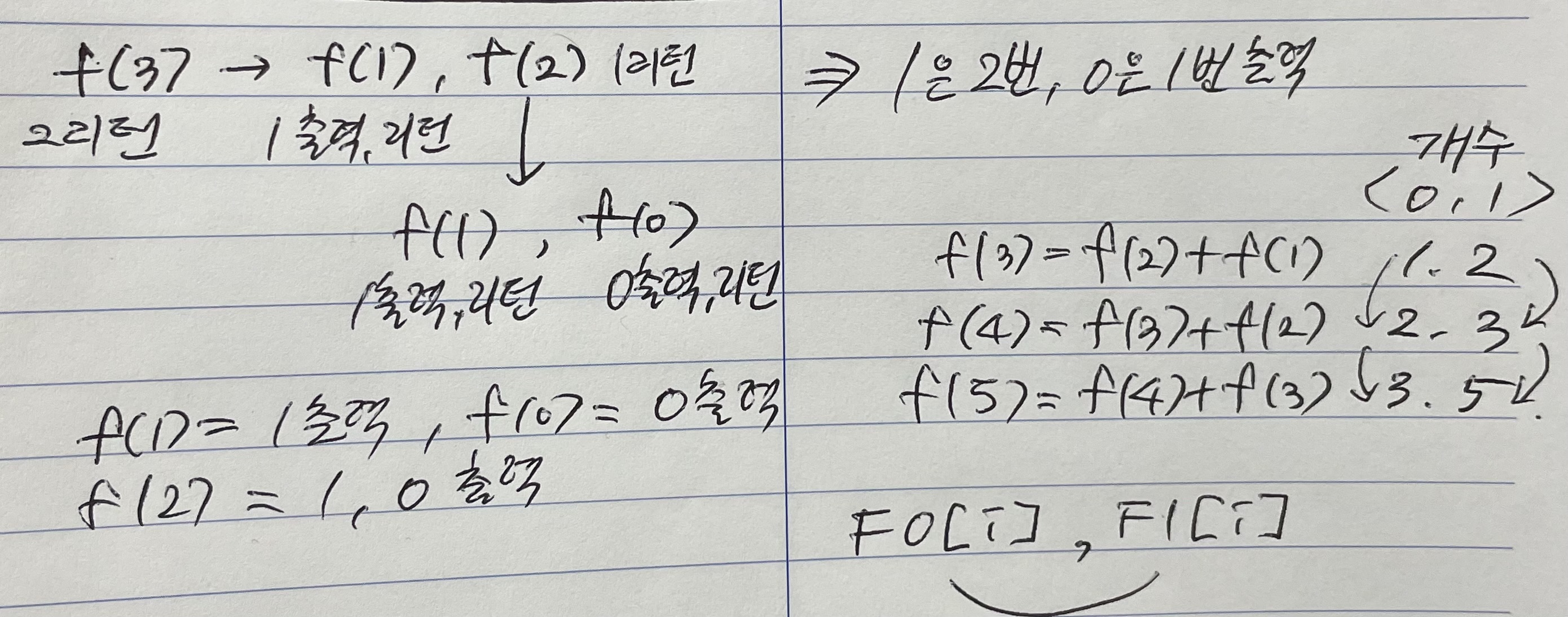 1은 2번 출력되고, 0은 1번 출력된다. N이 주어졌을 때, fibonacci(N)을 호출했을 때, 0과 1이 각각 몇 번 출력되는지 구하는 프로그램을 작성하시오.