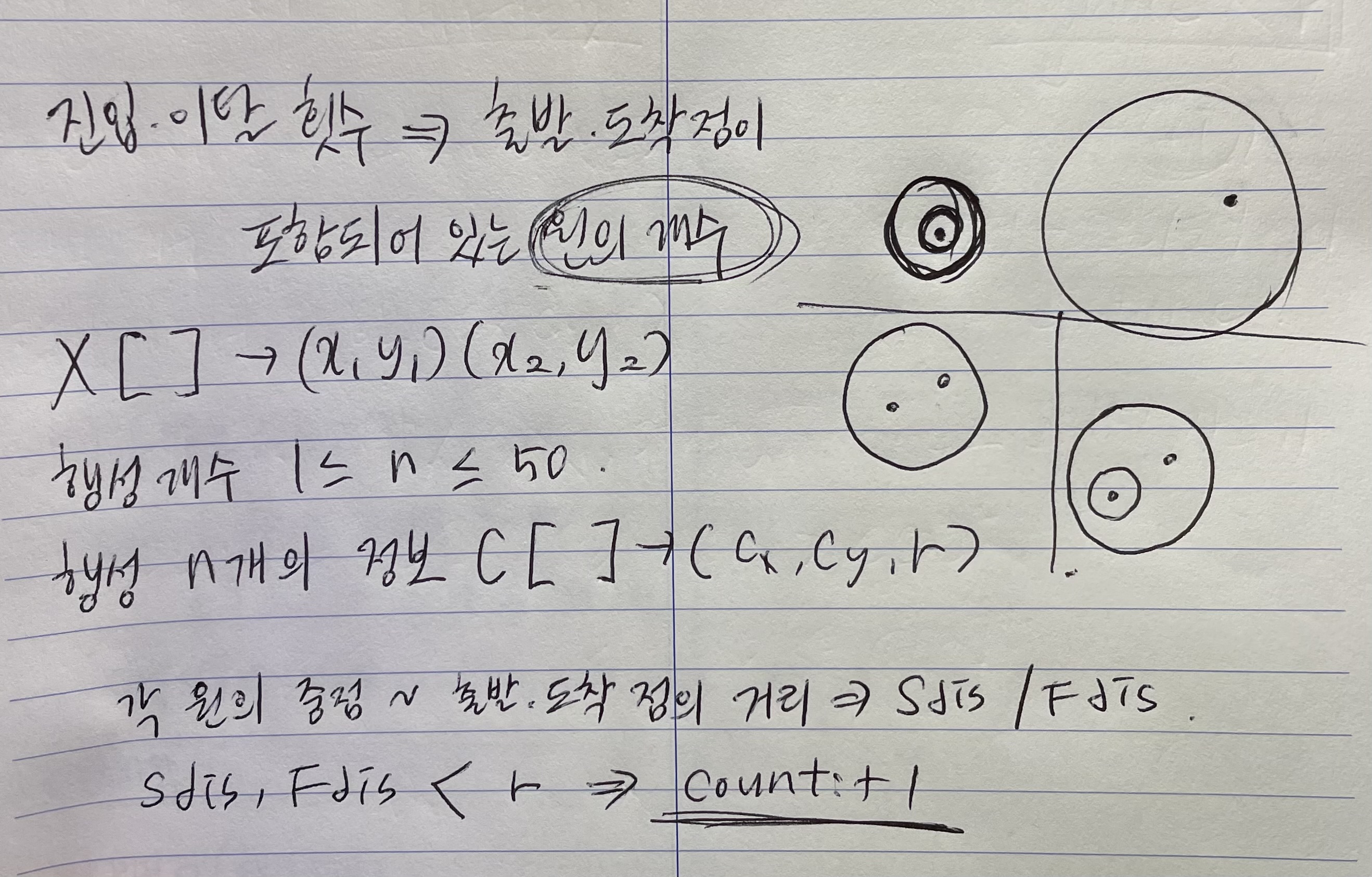 위와 같은 은하수 지도, 출발점, 도착점이 주어졌을 때 어린 왕자에게 필요한 최소의 행성계 진입/이탈 횟수를 구하는 프로그램을 작성해 보자. 행성계의 경계가 맞닿거나 서로 교차하는 경우는 없다. 또한, 출발점이나 도착점이 행성계 경계에 걸쳐진 경우 역시 입력으로 주어지지 않는다.