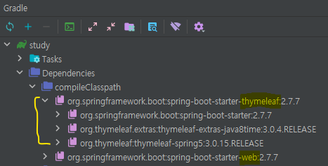 라이브러리 간의 의존관계인 dependencies를 보면, thymeleaf외 web이 있는 것을 볼 수 있다.