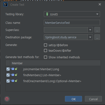 ① 단축키를 이용해서 테스트코드 틀을 생성한다.